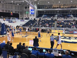 We got to our seats and within just a few minutes, Hofstra Head Coach Joe Mihalich came up to say hi. It turns out besides the small contingent of Hofstra fans behind the Pride bench, Matt and I were likely the only two other Hofstra fans in the building. And when we came to our seats, you could tell we were Hofstra fans by Matt's gold Hofstra jersey, which he got several years ago. Coach Mihalich mentioned that he saw Matt's jersey and he wanted to come up to say hi. He also noted that next time that we were going to go to a road game to contact them so he could leave us tickets. This was again noted to me when Assistant AD Jay Artinian and Stephen Gorchov when they came by to say hi.